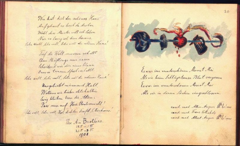 Einige originelle Zeichnungen sowie Fotos schmücken das Album, darunter Foto, das die Herren F. Haußler NormanniaeMünchen, K. Hensold und W. Gfrörer Onoldiae und einen stud. Wiedmann beim Kartenspiel zeigt. Drei scharfe Partien aus dem Jahr 1907 sind paukbuchartig verzeichnet und illustriert: Albin Angerer Moenaniae (xx) c/a Friedrich Stellwaag Onoldiae, Franz Vollnhals c/a G. Flierl Bavariae Erlangen und Albert Angerer Moenaniae (xxx) c/a Walter Gfrörer Onoldiae. Einige der Einträger hinterließen zusätzlich kernige Gedichte; als Beispiel soll ein Lied der „Angerer Brothers“ aus Würzburg zitiert werden. Es findet sich auf Seite 30 des Tagebuchs.